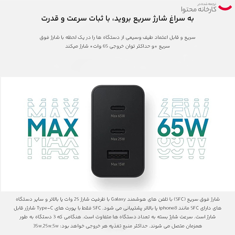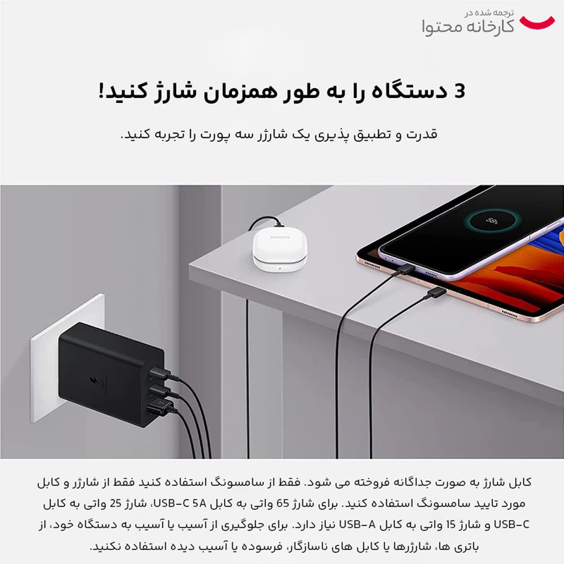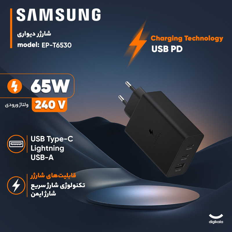 شارژرهای دیواری یکی از پرمصرفترین لوازم جانبی الکترونیکی هستند. داشتن یک شارژر با کیفیت میتواند علاوه بر حفظ سلامت باتری گوشی موبایل، زمان شارژ شدن باتری گوشی را هم کاهش دهد. یکی از محصولات باکیفیت و فوقالعاده مطلوب موجود در بازار، توسط شرکت سامسونگ طراحی و روانه بازار شده است. شارژر دیواری سامسونگ مدل EP-T6530 65W یک شارژر با چندین قابلیت است. این مدل دارای سه خروجی با امکان شارژ در توانهای متفاوت است. با استفاده از این محصول میتوان گوشی یا تبلت را به صورت Super Fast شارژ کرد. برای EP-T6530 خروجی USB-C و یک خروجی USB-A دارد که امکان شارژ همزمان سه دستگاه هم فراهم شده است. در مجموع شارژر دیواری سامسونگ مدل EP-T6530 65W را میتوان یک محصول پرقدرت و با کیفیت برای سریعتر شارژ شدن گوشی موبایل دانست.