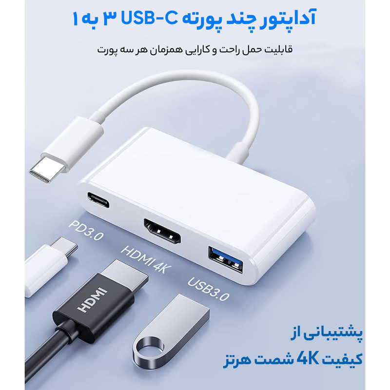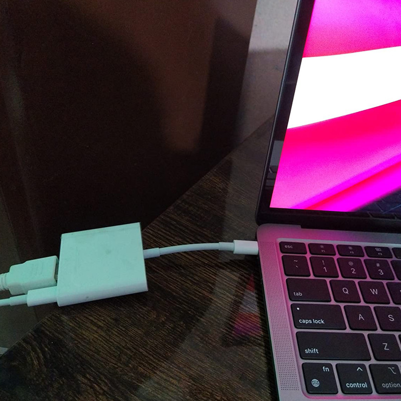 یک کابل برای استفاده از درگاه های HDMI, USB-C و USB. بیشترین ضخامت برخی از لپتاپهای جدید، بهسختی به 13.1 میلیمتر میرسد. این موضوع فضای خیلی کمی را برای درگاههای ارتباطی ازجمله USB ها(که 7.5 میلیمتر هستند) باقی میگذارد. هر کانکتور دیگری نیز برای اتصال به مادربورد، علاوه بر فضایی برای خود کانکتور، نیاز به مقداری کلیرنس عمودی نیز دارند. ورود کانکتور ها و درگاههای ارتباطی USB-C، سازندگان کامپیوتر، لپتاپ و تبلت ها را برای تولید محصولاتی سبکتر و باریک تر کمک کرده است. شرکتهای بزرگی مثل اپل، دل، HP، اینتل، مایکروسافت و سامسونگ به استفاده از این کانکتور ها روی آوردهاند. این کابل امکان اتصال درگاه USB-C به کانکتور های HDMI, USB و USB-C را فراهم می کند. از این طریق می توان هم فایل های ویدئویی با کیفیت اولترا HD را مشاهده کرد و هم همزمان از طریق درگاه USB-C اقدام به شارژ کرد. این مبدل کوچک که ساخت شرکت اپل است، کار با مک بوک ها را راحت تر کرده است.