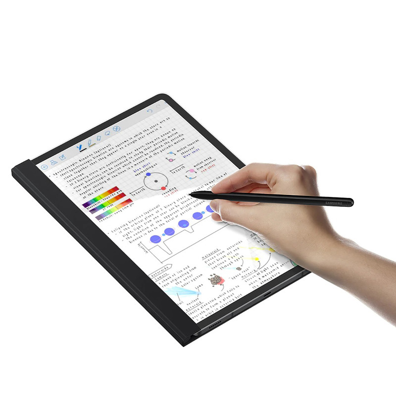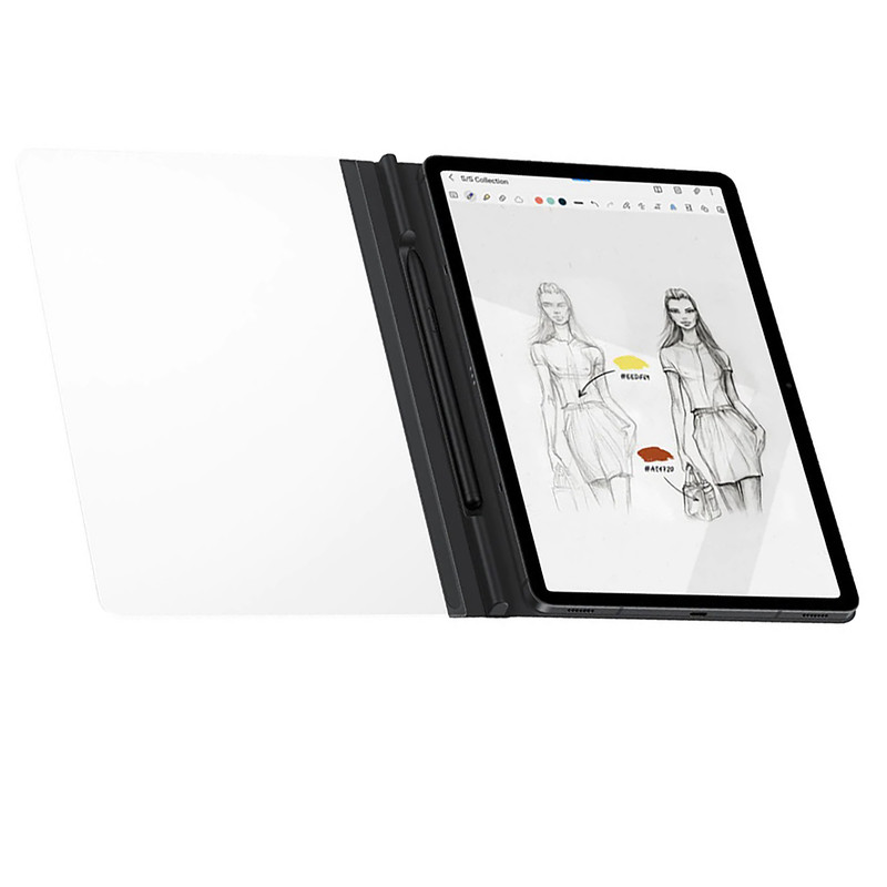 با کاور نوآورانه و اصلی Samsung Note View برای +Galaxy Tab S8+، Galaxy Tab S7 ، می خواهید روی یک تکه کاغذ بنویسید. به لطف ویژگی هوشمند آن، برای استفاده از قلم S خود مجبور نخواهید بود درب جلویی شفاف آن را باز کنید تا بتوانید از لک و خط و خش جلوگیری کنید. پوشش Note View به صورت مغناطیسی به تب Galaxy Tab شما متصل می شود و همچنین یک محفظه برای S Pen شما وجود دارد.