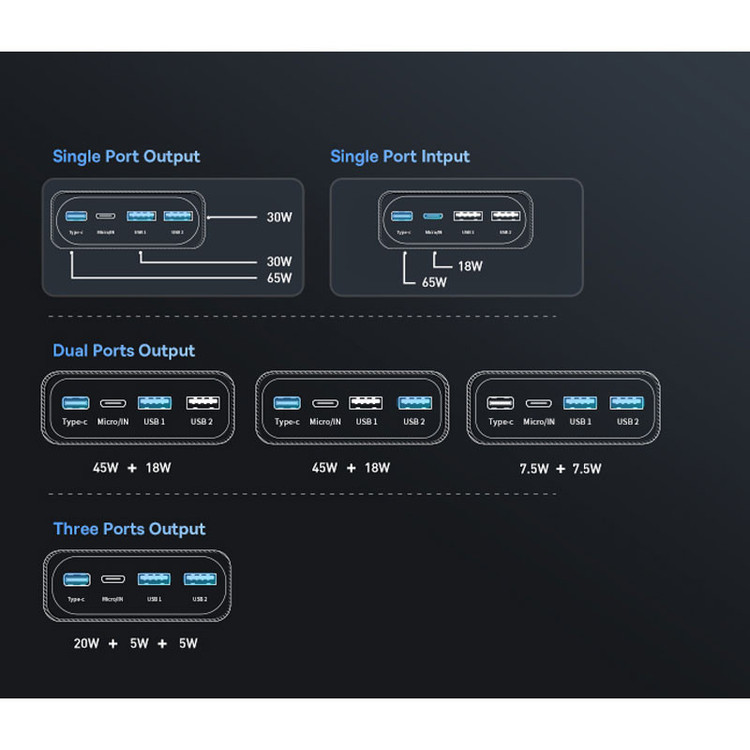 مشخصات فنی: حداکثر توان خروجی تا 65 وات / امکان شارژ کردن دستگاه با درگاه USB-C با توان 65 وات / مجهز به 2 درگاه USB-A / مجهز به 1 درگاه USB-C / مجهز به درگاه ورودی micro USB تا توان 18 وات / قابلیت شارژ همزمان تا ۳ دستگاه بهصورت همزمان
